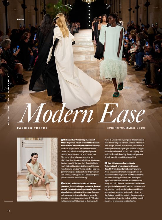 Exklusiv für Welcome Magazine präsentiert Mode-Expertin Nadia Tschenett die aktuellen Trends der internationalen Runways. Nach sechs Jahren im Fashion Resort der deutschen ELLE leitete die gebürtige Meranerin als Unit Director von LOEWS, der führenden deutschen PR-Agentur im High Fashion Business, die Mode-Etats von Burberry und Jil Sander. Seit ihrer Rückkehr nach Südtirol berät sie größere und kleinere Kunden rund um das Thema Mode. Hauptaugenmerk legt sie dabei auf die Organisation von Events, Styling und die Umsetzung von professionellen Fotoshootings.