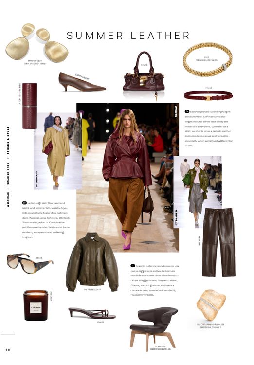Leder zeigt sich überraschend leicht und sommerlich. Weiche Qualitäten und helle Naturtöne nehmen dem Material seine Schwere. Ob Rock, Shorts oder Jacke: In Kombination mit Baumwolle oder Seide wirkt Leder modern, entspannt und vielseitig tragbar.