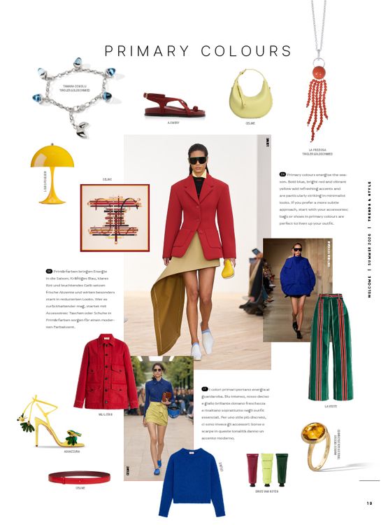 Primärfarben bringen Energie in die Saison. Kräftiges Blau, klares Rot und leuchtendes Gelb setzen frische Akzente und wirken besonders stark in reduzierten Looks. Wer es zurückhaltender mag, startet mit Accessoires: Taschen oder Schuhe in Primärfarben sorgen für einen modernen Farbakzent.