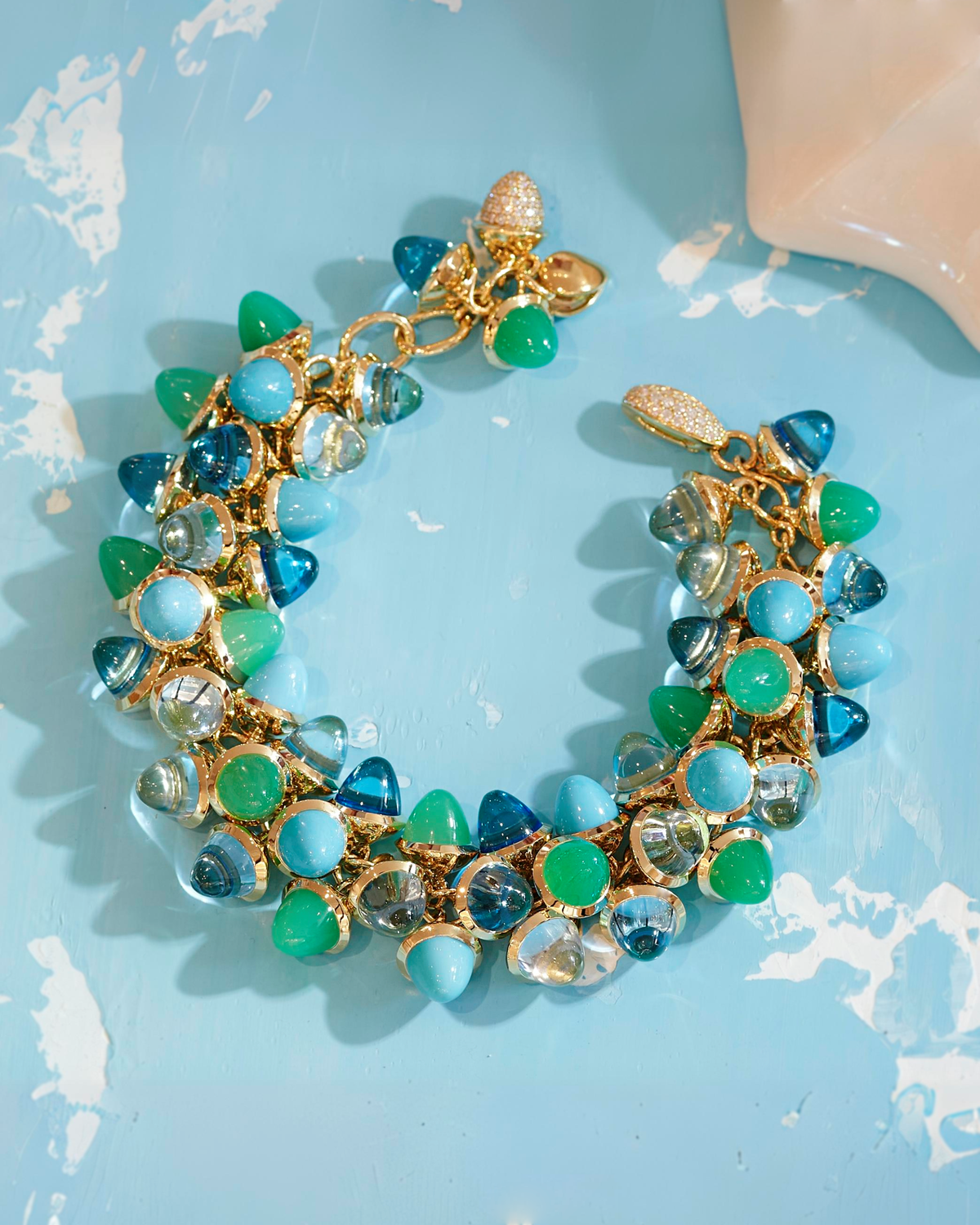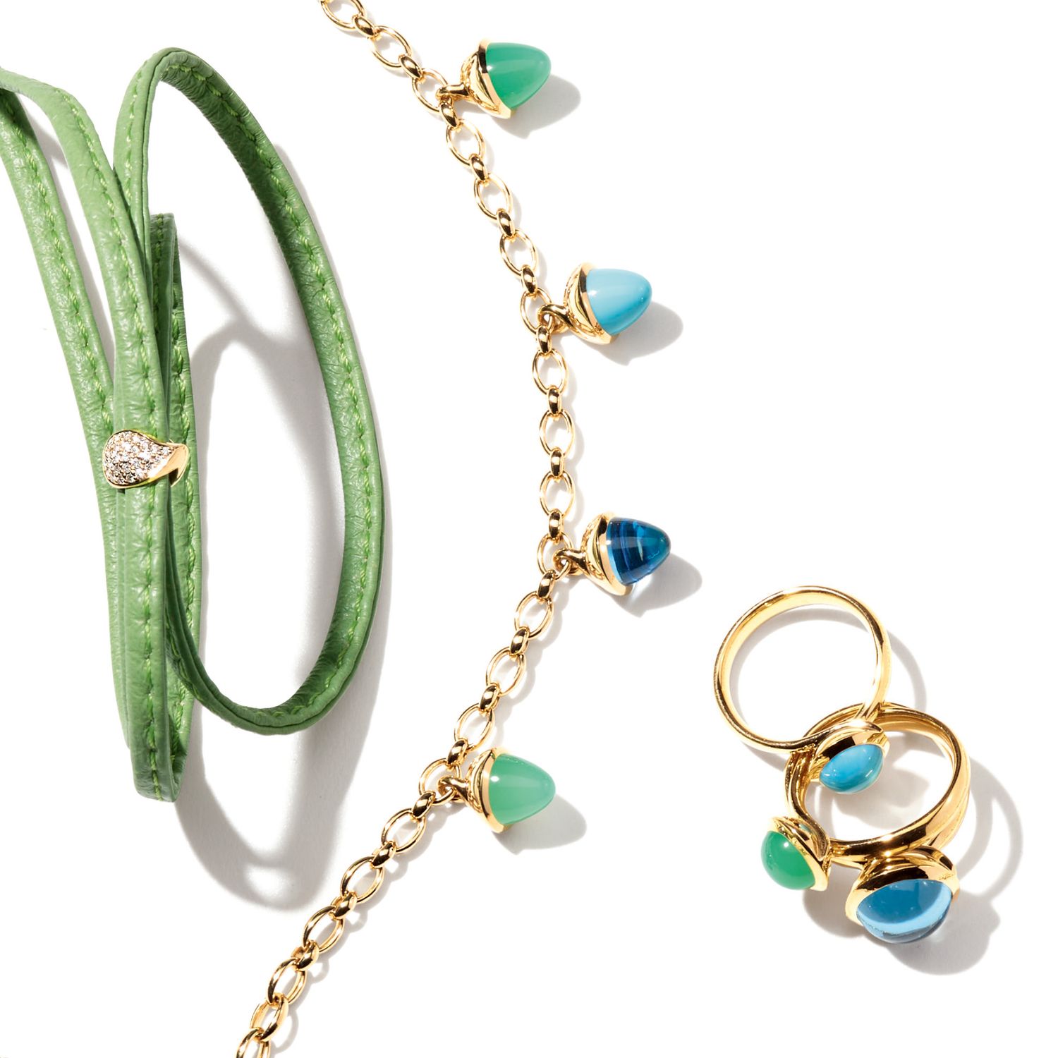 Questi colori intensi raccontano di un paradiso di pace in cui ritrovare se stessi, liberi dalle distrazioni e dallo stress del mondo moderno. Il prezioso crisoprasio funge da scudo protettivo contro le energie negative, mentre il turchese rafforza la fiducia in se stessi e la grinta e il topazio mantiene un’aura di calma.